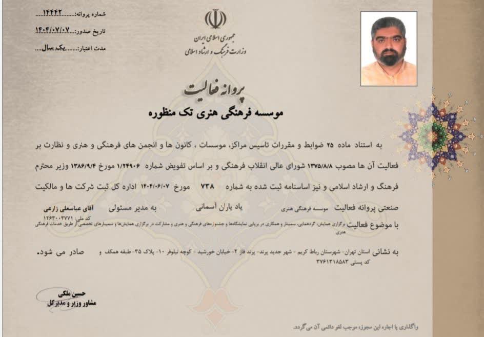موسسه فرهنگی هنری یادیاران آسمانی (مویانا) آدرس ایمیل : Moyanaa60@gmail.com تماس : 09305757595 ادرس : تهران.اتوبان ساوه. قبل از خروجی پرند. شهرک خانه تهران. جنب مسجد امام حسن مجتبی علیه السلام تلفن : 56794170-021 ۱۴۰۱۴۶۸۱۷۶۶ شناسه ملی شماره ثبت: ۷۳۸ مسیربابی Whatsapp Instagram چارت موسسه شامل : مدیرعامل: دکتر عباسعلی زارعی دکترای مدیریت فرهنگی فرهنگی: دکتر مجيد سمائی هنری: دکتر الهام میرزایی اجرایی: دکتر روح الله روزمهر مالی ومنابع انسانی: زهرا زارعی فن آوری اطلاعات : مهندس علی شکور روابط عمومی و امور رسانه: امیرمحمد زارعی پروانه فعالیت:
